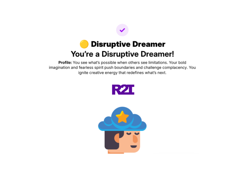 As a Disruptive Dreamer, you thrive in the yellow-hot zone of creative ideation. You bring unconventional ideas, alternative perspectives, and imaginative solutions to the table. You help teams break out of comfort zones and rethink what’s possible.